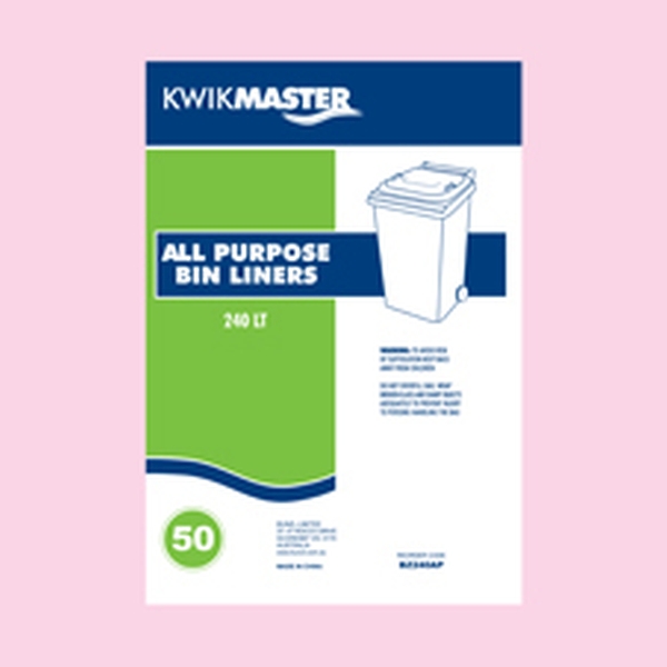 The Kwikmaster All-Purpose Black Bin Liner, with a 240L capacity, is designed for heavy-duty commercial cleaning tasks. Made from durable, high-quality materials, these liners offer exceptional strength and flexibility, making them ideal for handling larger or more demanding waste loads.